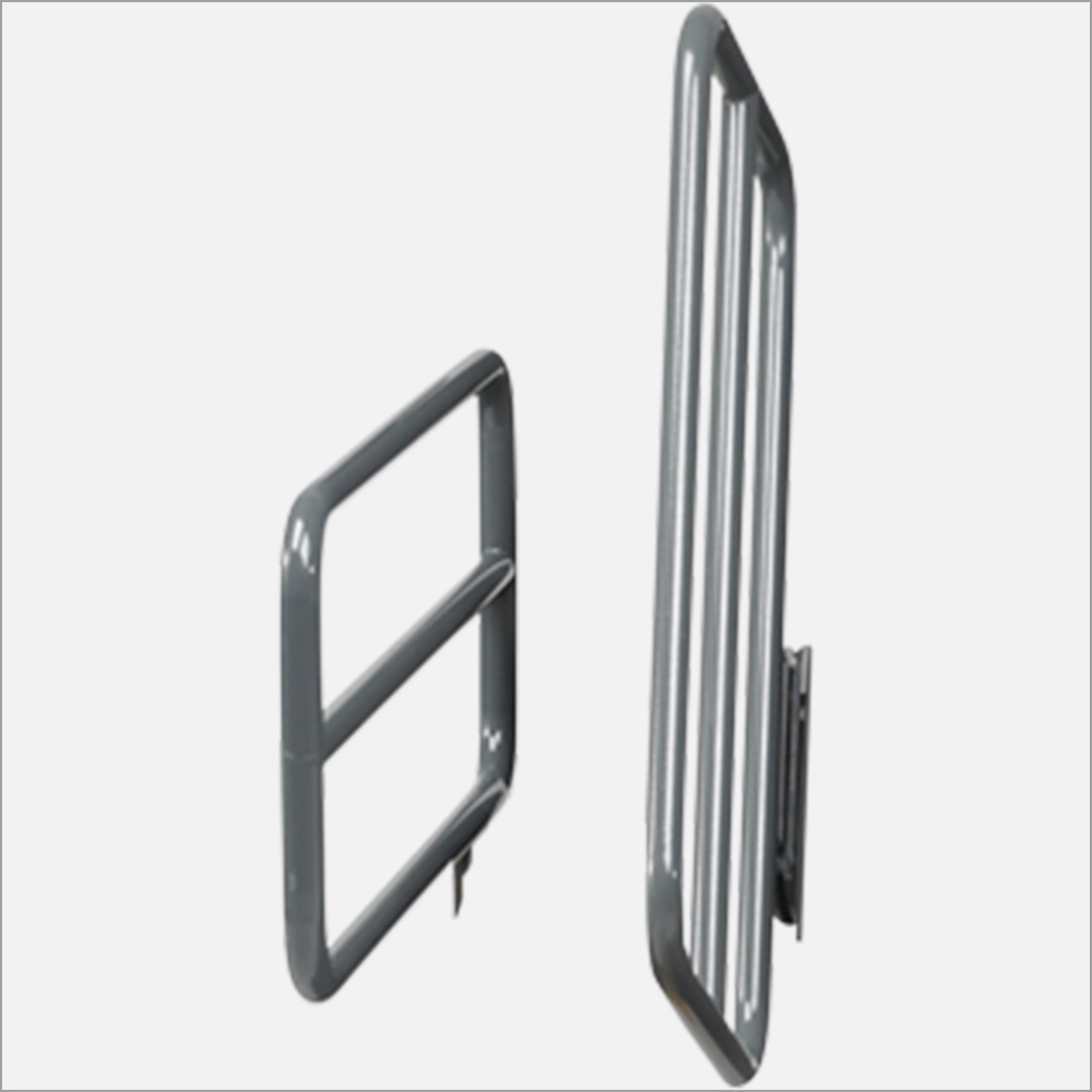 Om du vill ha grindar för RotoBed®Home finns det två olika storlekar. Den korta modellen placeras nära ryggstödet för att ge skydd och stöd i samband med förflyttningar i sängen. Den längre modellen i mitten av sängen ger bra stöd när du går in och ut ur sängen. Båda modellerna är tillgängliga i metall eller i ekfaner för en mer estetisk look.